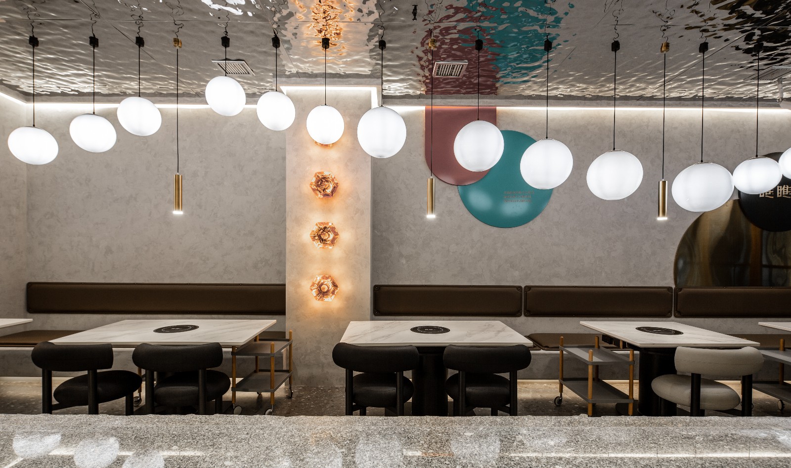 美丽的吊顶还需要灯光的映衬,方能展现完美,因此挑选合适的灯饰就非常有必要了,很多人喜欢用吊灯来映火锅店的气氛。