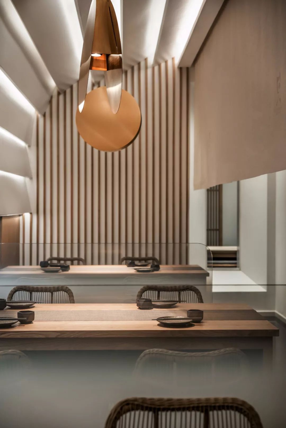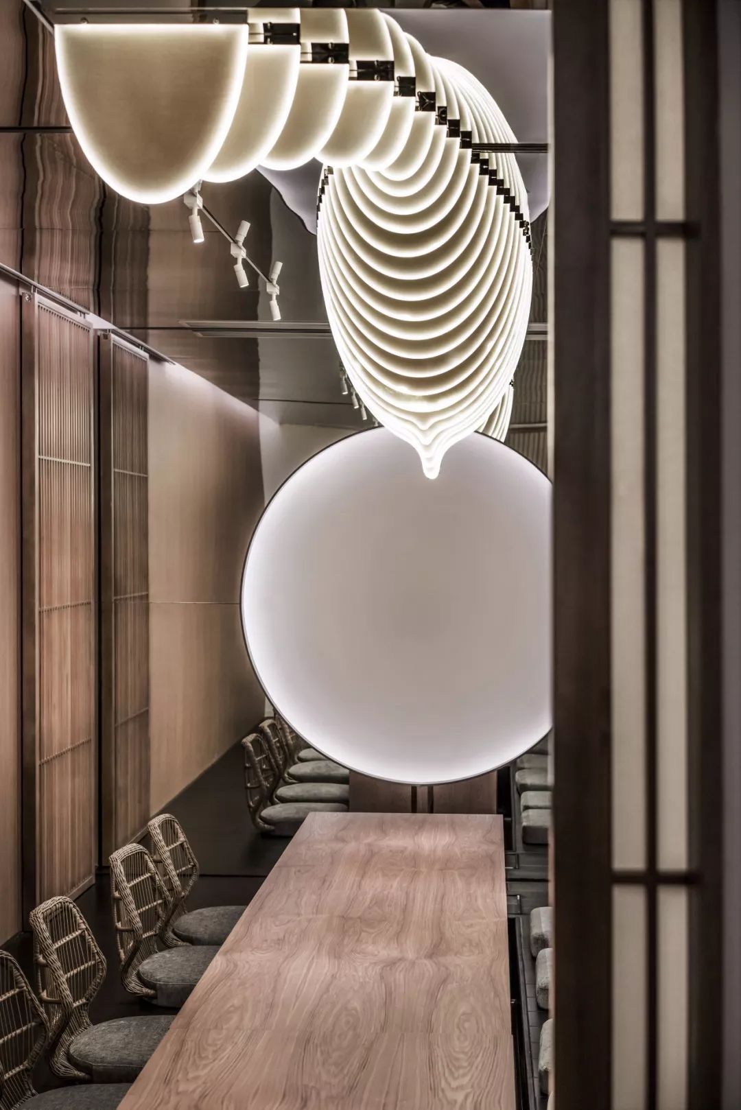 现在的日料店设计中主要的装修颜色就是浅棕色,尤其是浅棕色的木质台阁,具有非常浓郁的日式风情。搭配柔和自然的白色,气氛和谐融洽,令人舒适放松。
