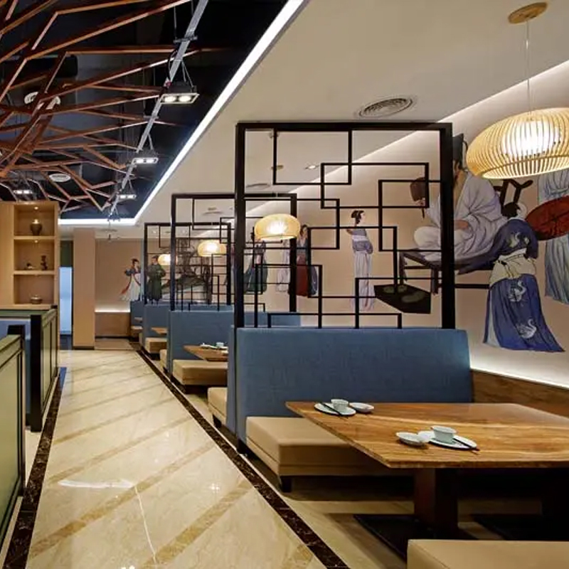 书法是中国特有的一种文字艺术表现形式,具有很高的欣赏价值,还有陶冶情操,丰富空间层次的作用。餐厅氛围的营造必然少不了墙壁的装饰,在空白的现代餐厅里挂上一幅名家书法字画,这更多的是一种文化的传达和艺术氛围的营造,同时也提升了餐厅的高雅品位。